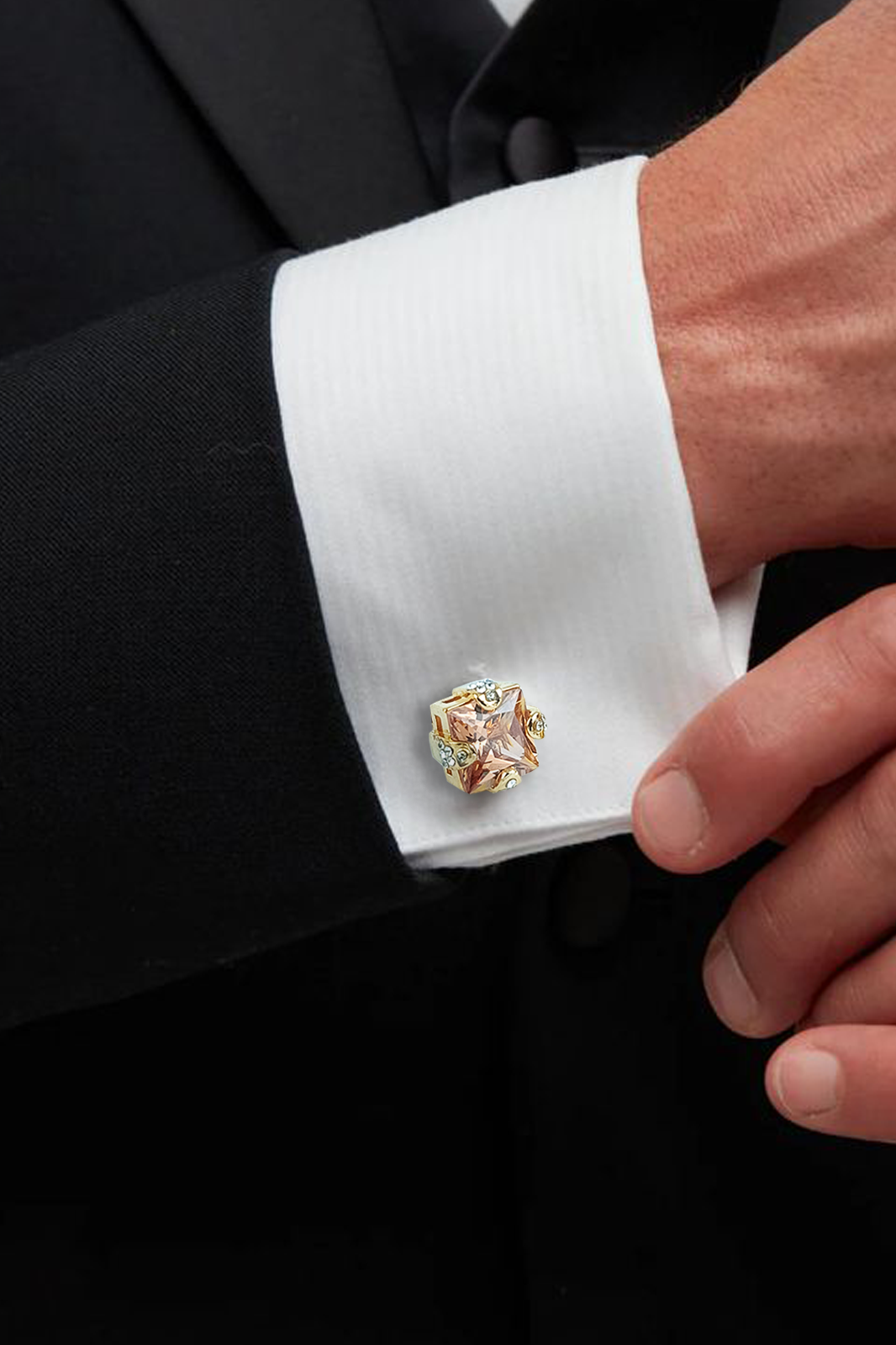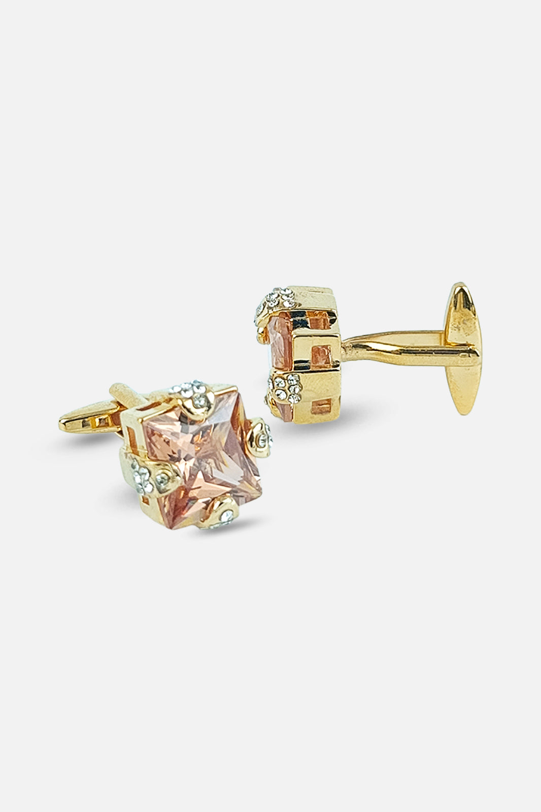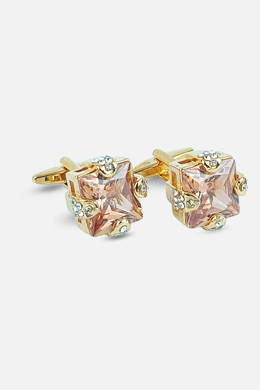 Add a touch of warm, radiant luxury to your ensemble with these striking gold-toned cufflinks featuring a centerpiece of soft champagne. Designed with a bold square silhouette, each piece showcases a large, princess-cut champagne crystal that captures and reflects light with exceptional brilliance. The central stone is elegantly secured by polished gold-toned prongs, which are further accented by delicate clusters of small, clear round crystals at each corner. This combination of tonal warmth and architectural detail makes these cufflinks a standout choice for high-end formal wear.